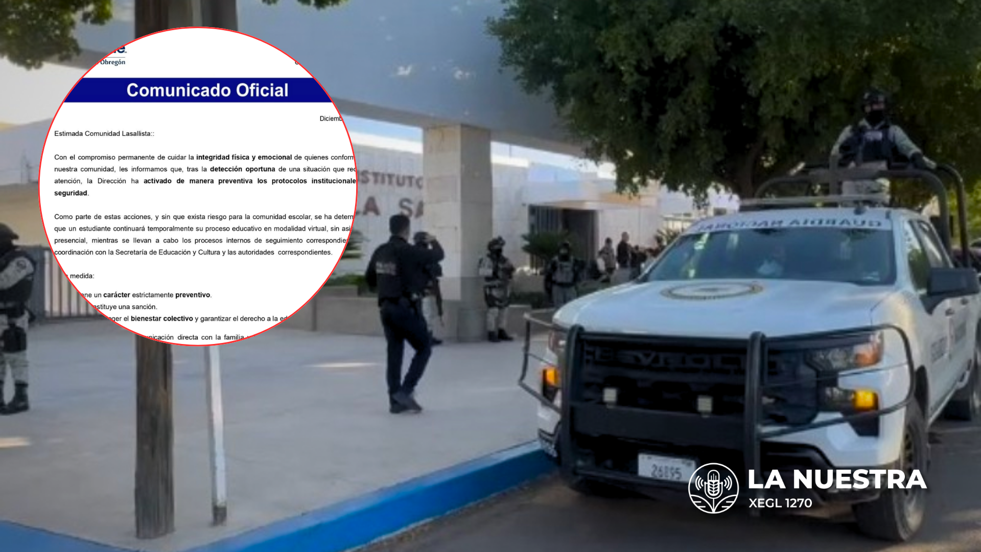 Ciudad Obregón, Sonora. – Un amplio operativo de seguridad, que incluyó a elementos de la Policía Municipal de Cajeme y de la Guardia Nacional, se desplegó durante la mañana del pasado martes en las inmediaciones del Instituto La Salle en Ciudad Obregón, luego de que se activaran los protocolos institucionales ante la presunta amenaza de un estudiante de realizar un atentado en el plantel.