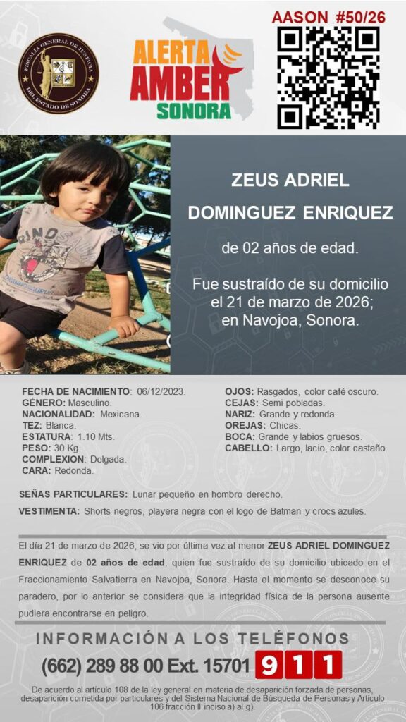 Las autoridades del estado de Sonora activaron una Alerta Amber para localizar al menor Zeus Adriel, de 2 años de edad, quien fue sustraído de su domicilio en el municipio de Navojoa.